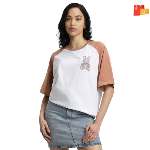 Women’s 100% Cotton Teddy Graphic T-Shirt | Colorblocked Design, Round Neck, Drop Shoulder (S to L)