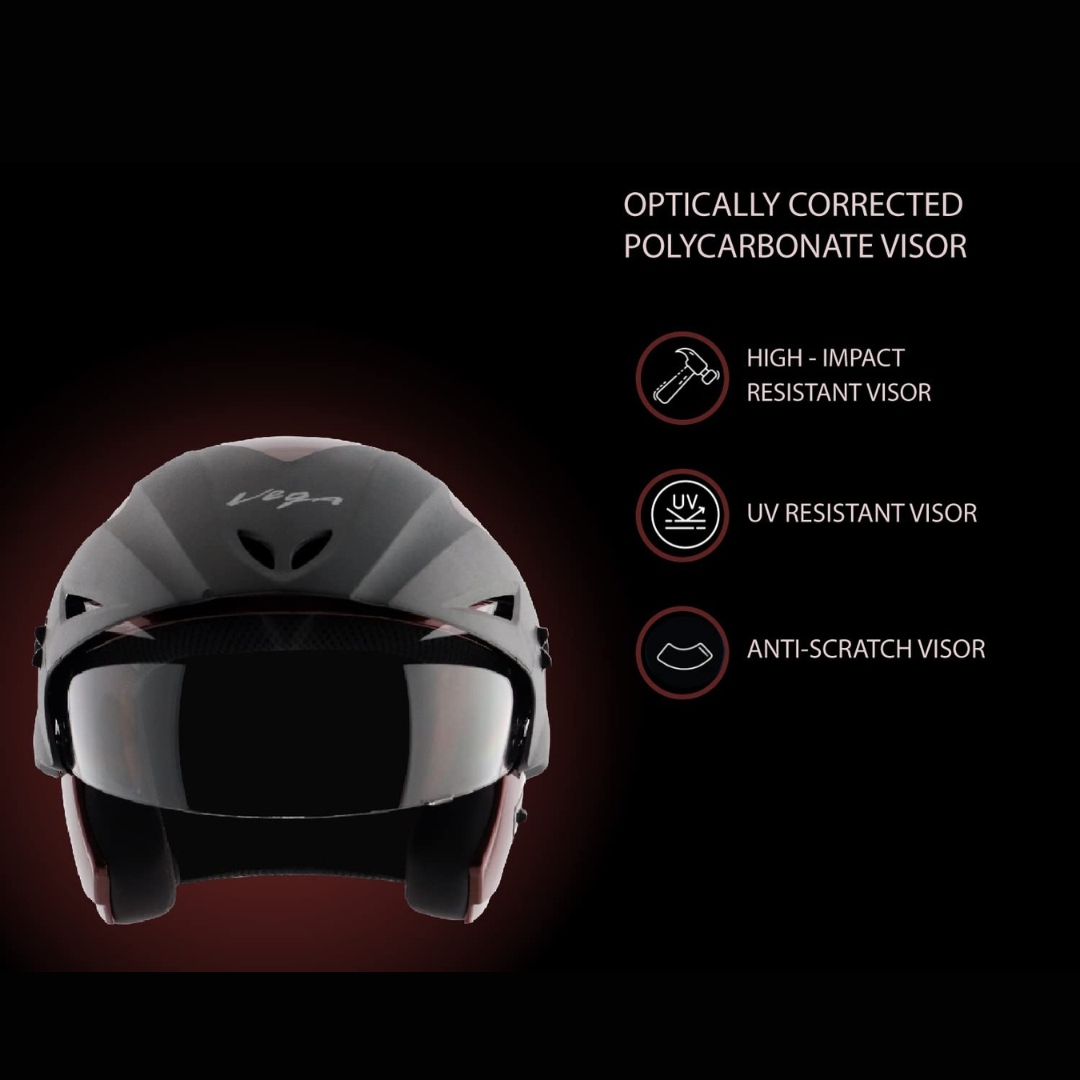 The Vega Cruiser Lightweight & Compact with Peak Open Face Helmet is built with a high-impact ABS shell that ensures enhanced durability and protection while keeping the helmet lightweight at just 950 grams—perfect for long or daily rides. It is ISI certified, ensuring it adheres to recognized safety standards.