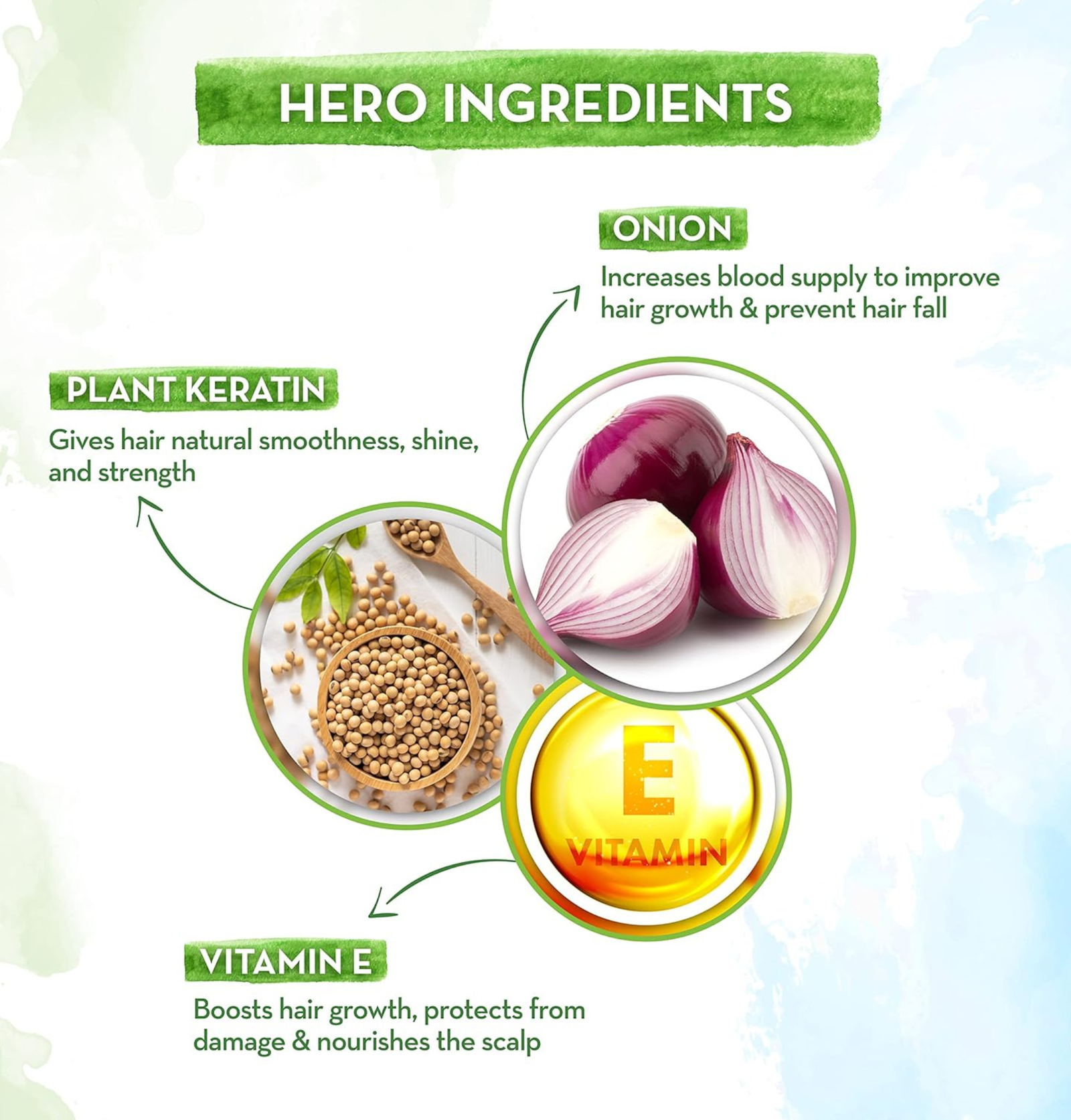 • Promotes Hair Growth: Infused with Onion Oil, it stimulates hair follicles, enhancing hair growth naturally.