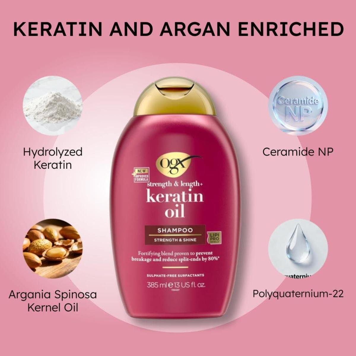 For resilient, silky, and beautifully polished hair, use OGX Strength & Length + Keratin Oil Fortifying Anti-Frizz Shampoo as part of your daily hair care routine, giving every strand strength, protection, and long-lasting smoothness.