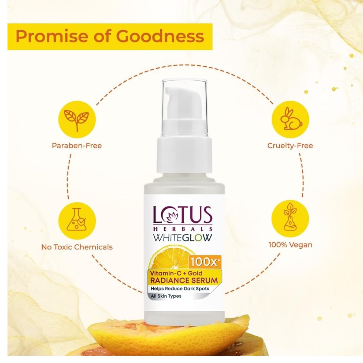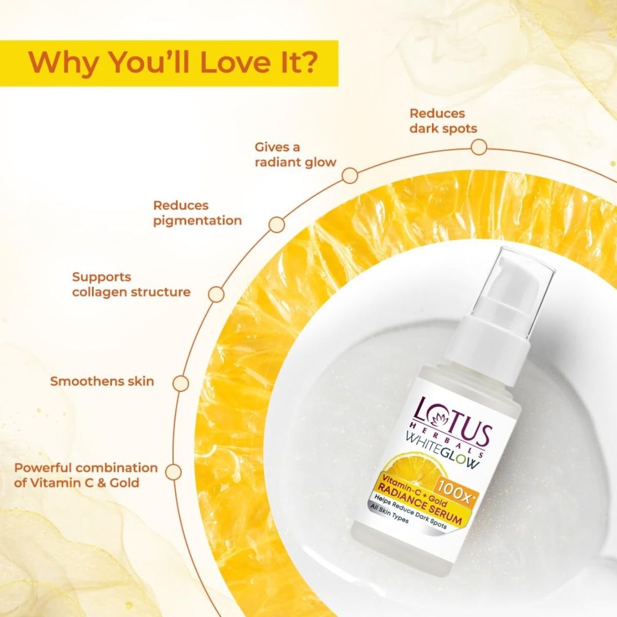 Achieve brighter, smoother, and more radiant skin with regular use of Lotus Herbals WhiteGlow Vitamin C and Gold Radiance Face Serum.