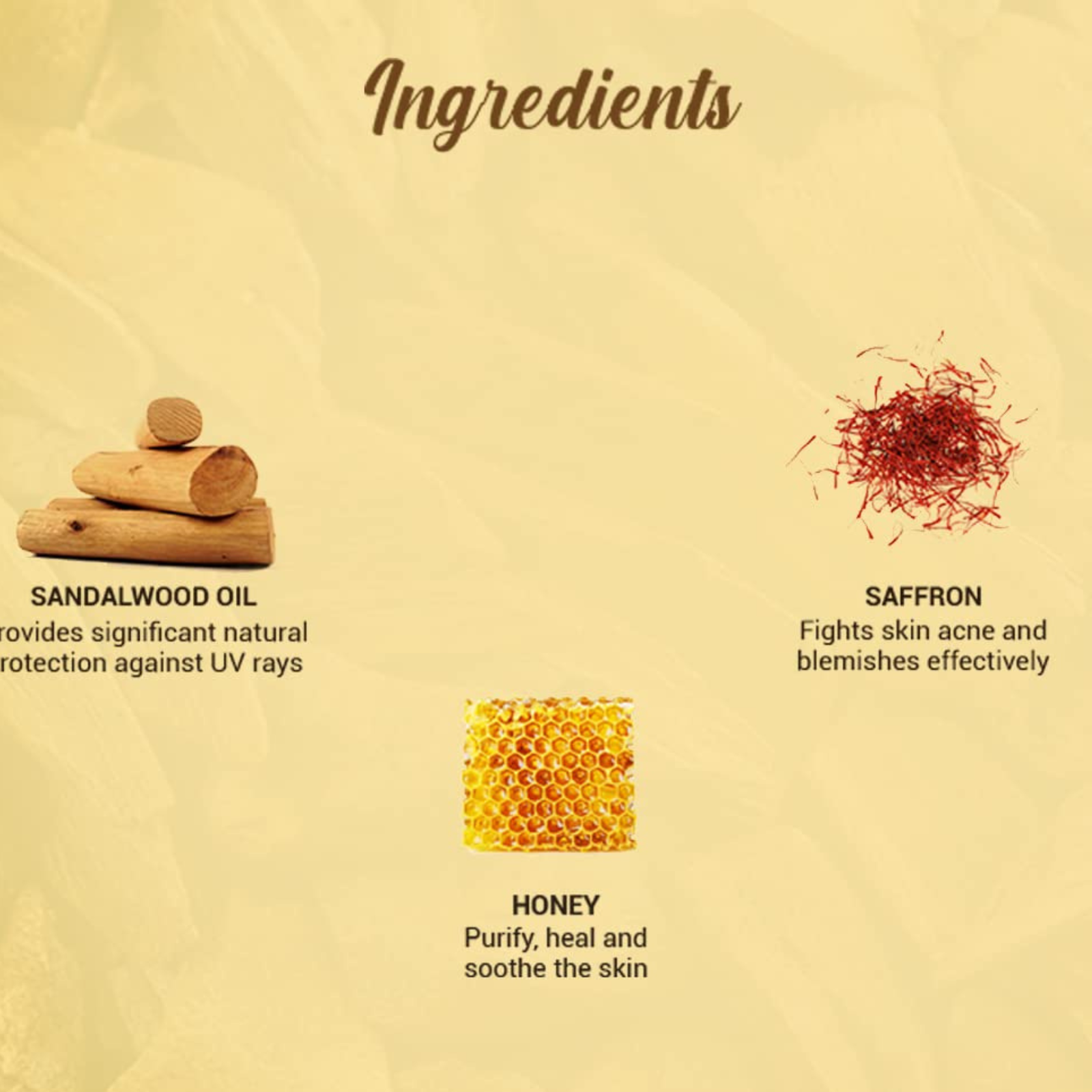 KEY INGREDIENTS: Infused with the goodness of Sandalwood oil that helps soothe, protect, and defend against UVA rays. Saffron reduces skin pigmentation, while Honey purifies, heals, and soothes the skin, keeping it soft, healthy, and moisturized.