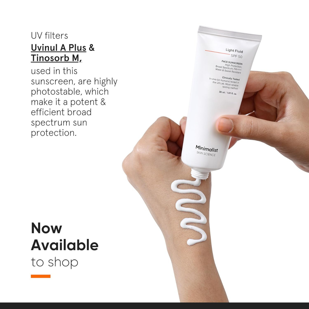 Minimalist Light Fluid Sunscreen SPF 50 for Oily Skin is expertly formulated with four highly effective UV filters Uvinul T 150, Avobenzone, Octocrylene, and Titanium Dioxide—to deliver broad-spectrum protection against harmful UVA and UVB rays.