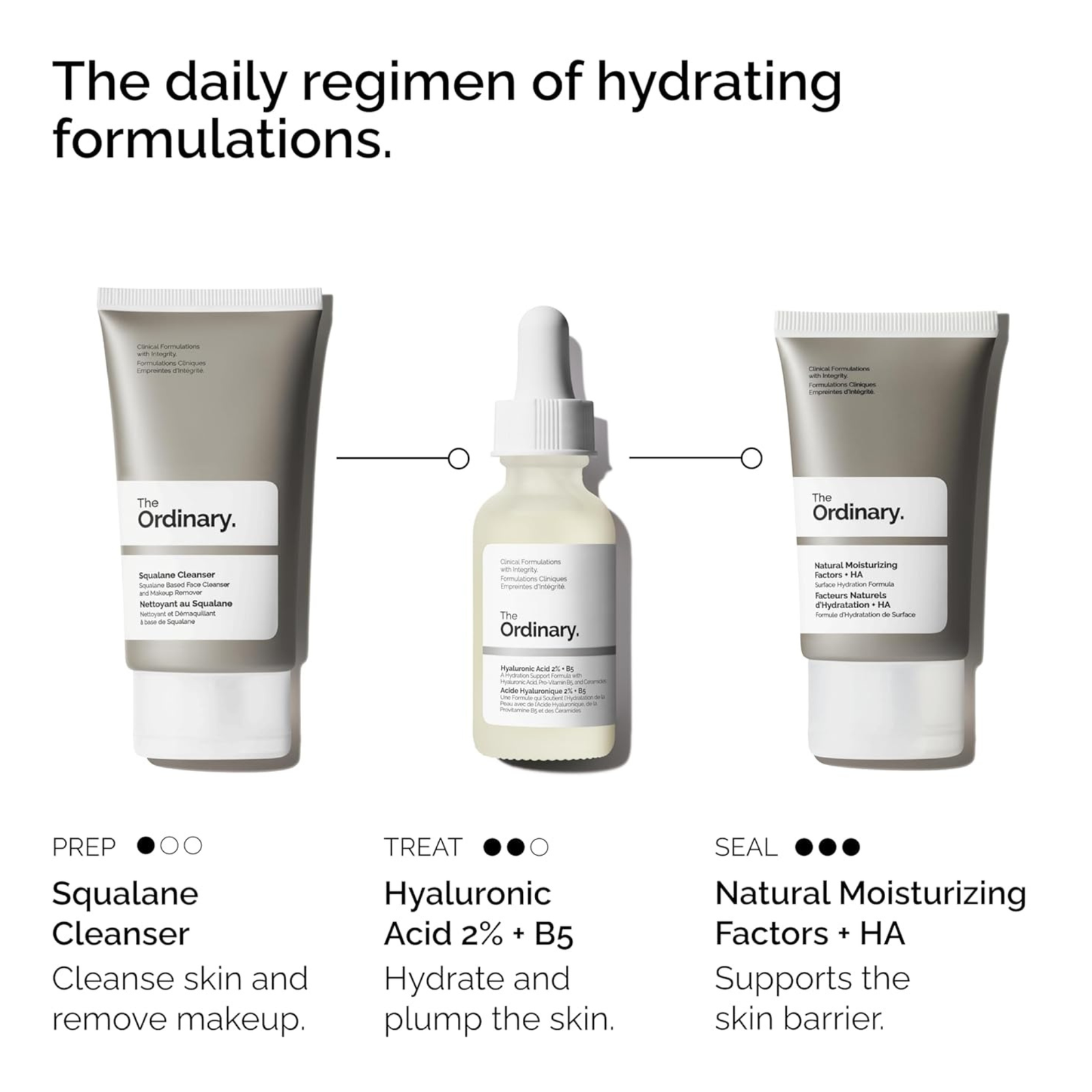 The Ordinary The Daily set starts with the Squalane Cleanser, a gentle yet effective formula that removes impurities and makeup without stripping the skin of its natural moisture. Following the cleanser, the Hyaluronic Acid 2% + B5 provides deep hydration, drawing moisture into the skin and helping to maintain a plump, refreshed appearance. Lastly, The Ordinary Natural Moisturizing Factors + HA locks in moisture, forming a protective barrier to keep skin soft, smooth, and nourished.