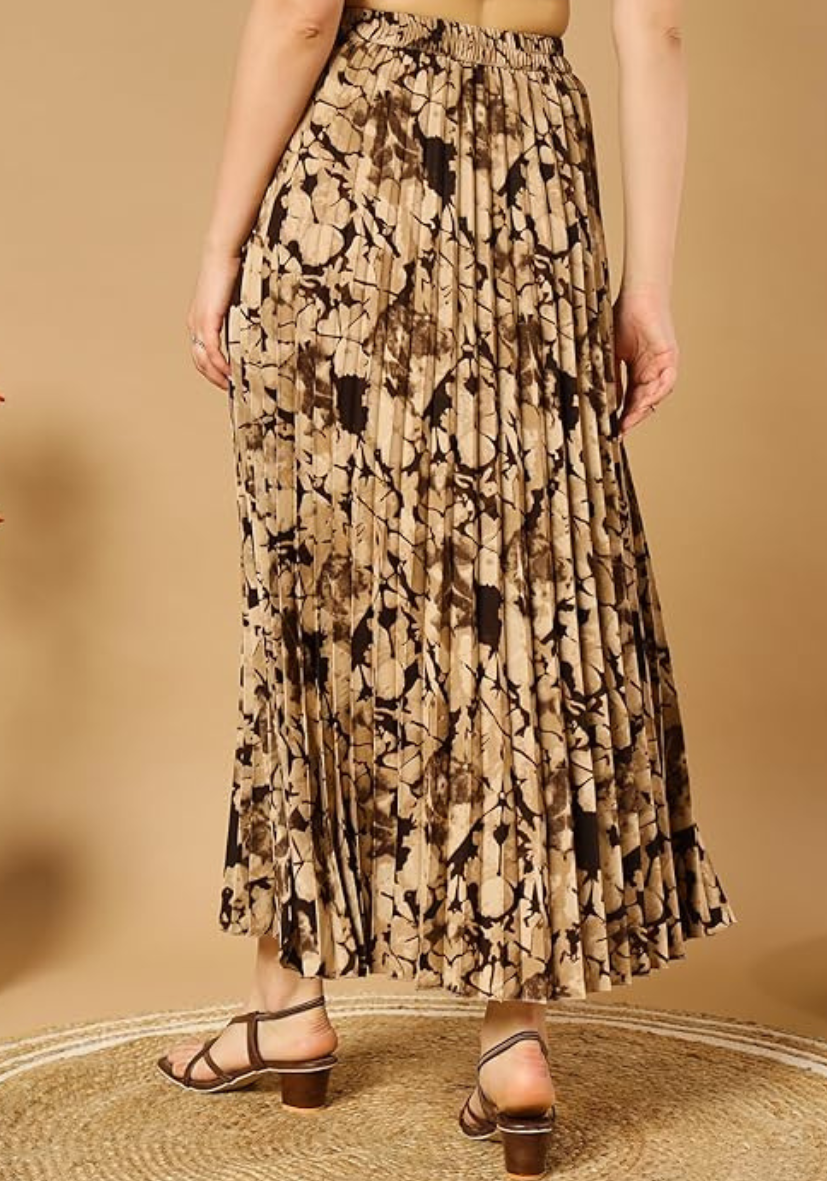 • Elegant Design: This women’s maxi skirt features a pleated silhouette and a floral print in shades of brown, exuding sophistication and style.